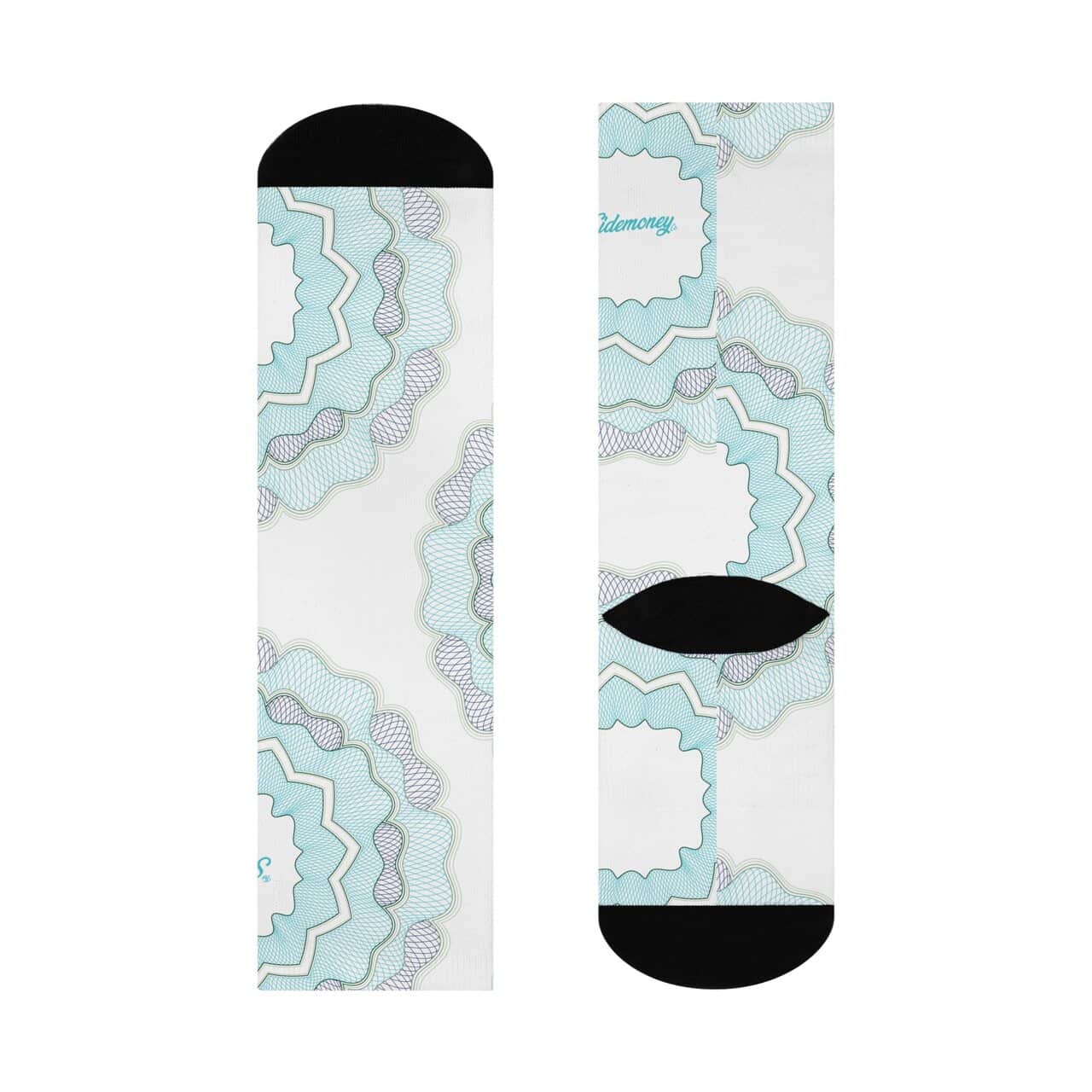 Series 003 Socks strip the concept down to its core. Inspired by the watermarks and security patterns found in currency, the design reimagines those protective details as a repeating visual code. Soft gradients of blue and gray create depth while the geometric rhythm gives the pattern a quiet pulse. Clean, minimal, and deliberate, this pair captures the balance between value and trust, proof and authenticity. It’s currency reduced to its essence, made to be worn with purpose.
